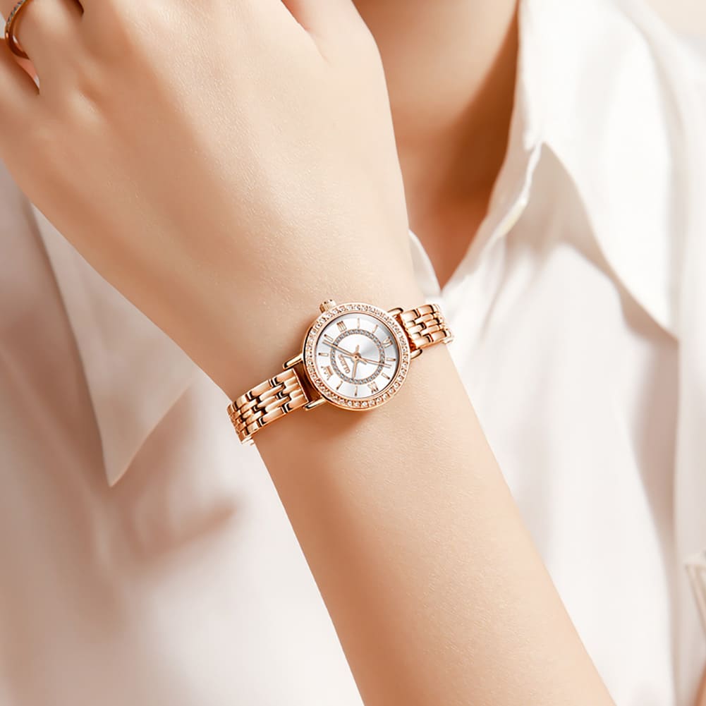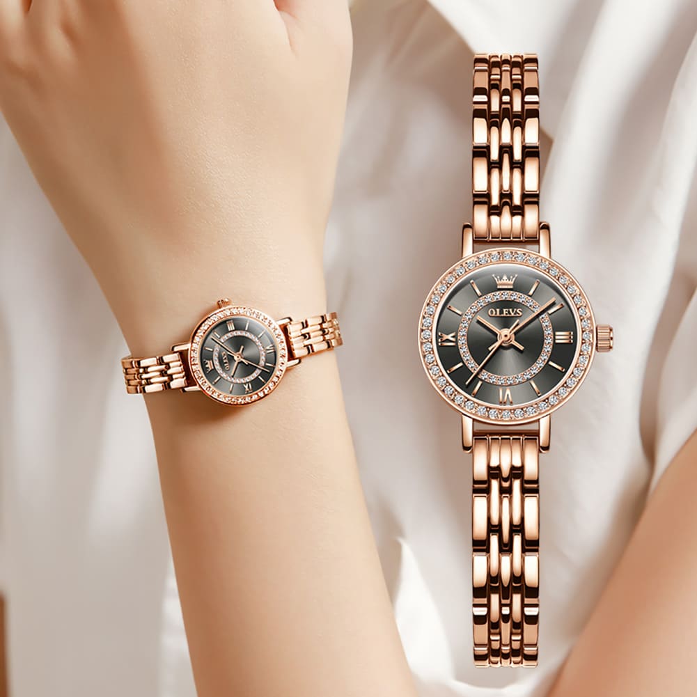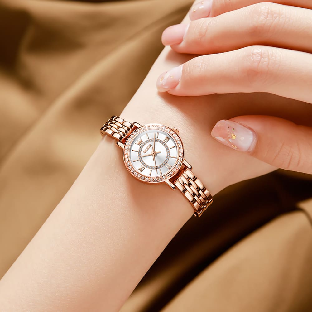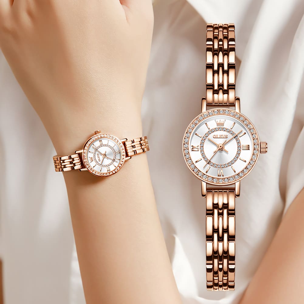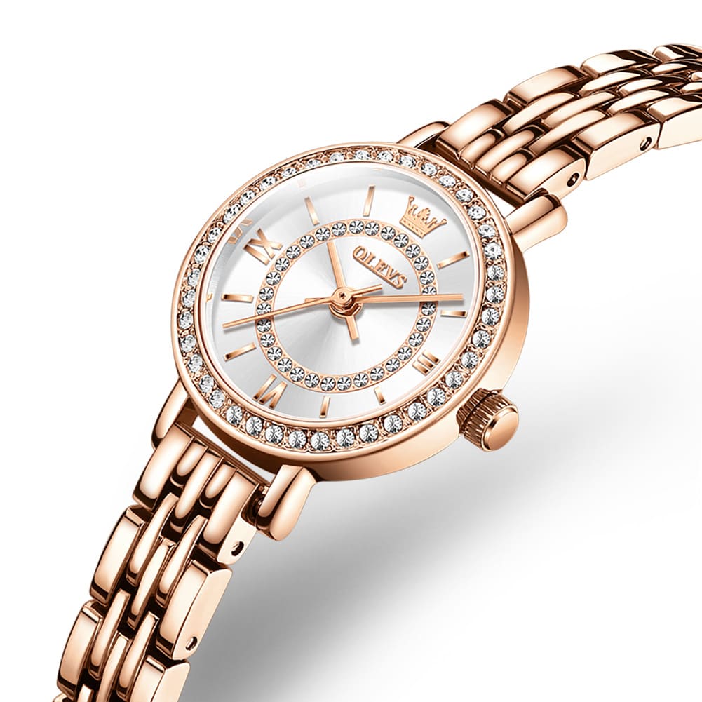 Small, sparkling, and sophisticated. The OLEVS 5508 is a jewelry-style timepiece designed for the delicate wrist. Featuring a petite 23mm case, it shines with a “Double Halo” of crystals—one ring on the bezel and another inside the dial. Finished in luxurious Rose Gold with a slim bracelet, it adds a touch of glamour to any outfit without feeling heavy.