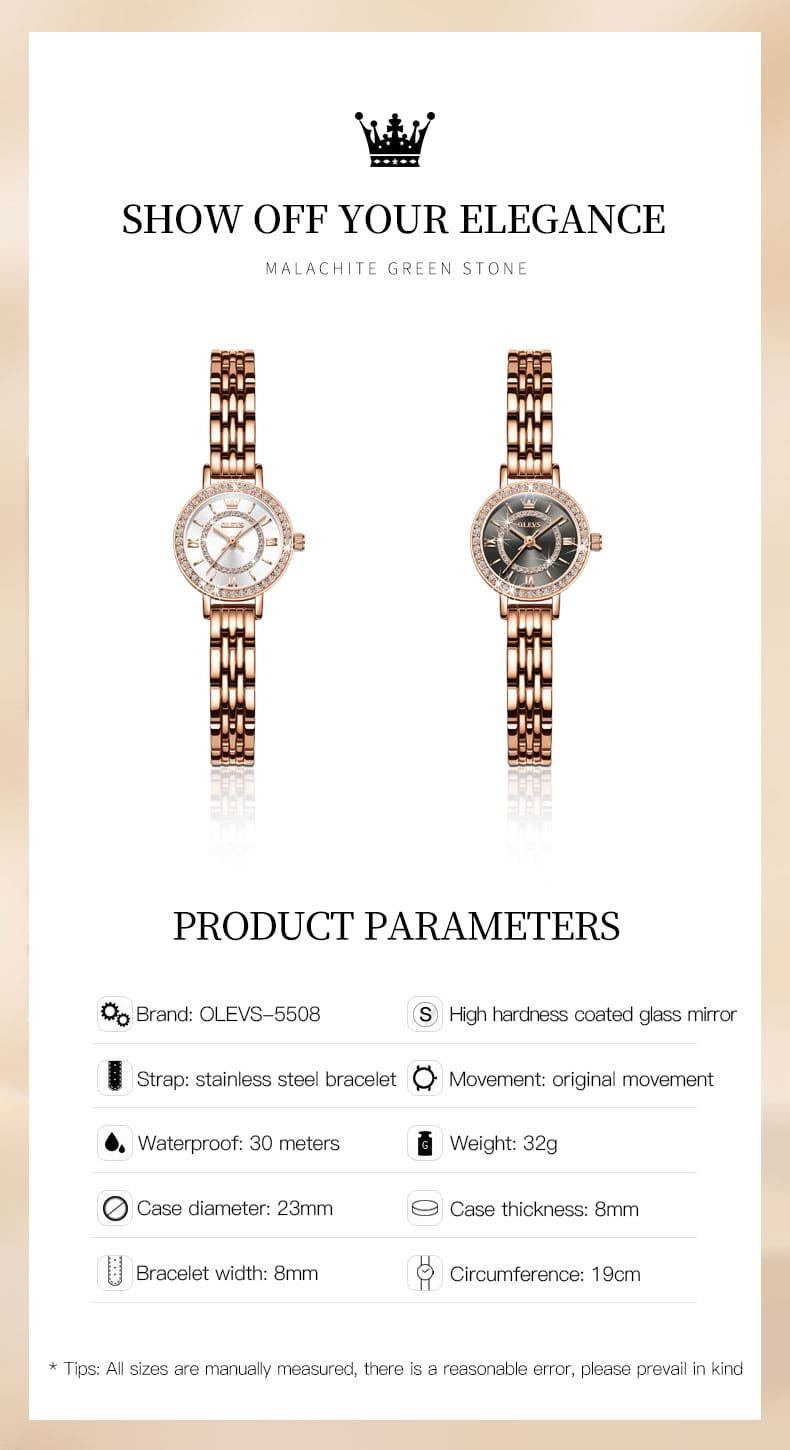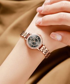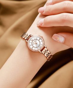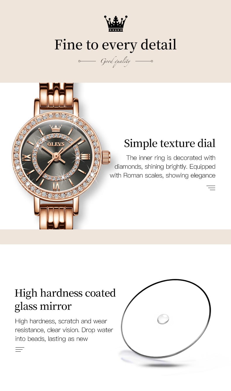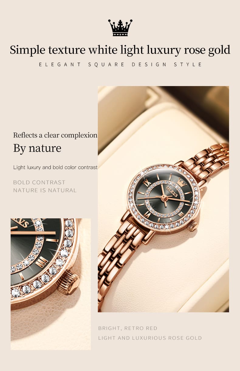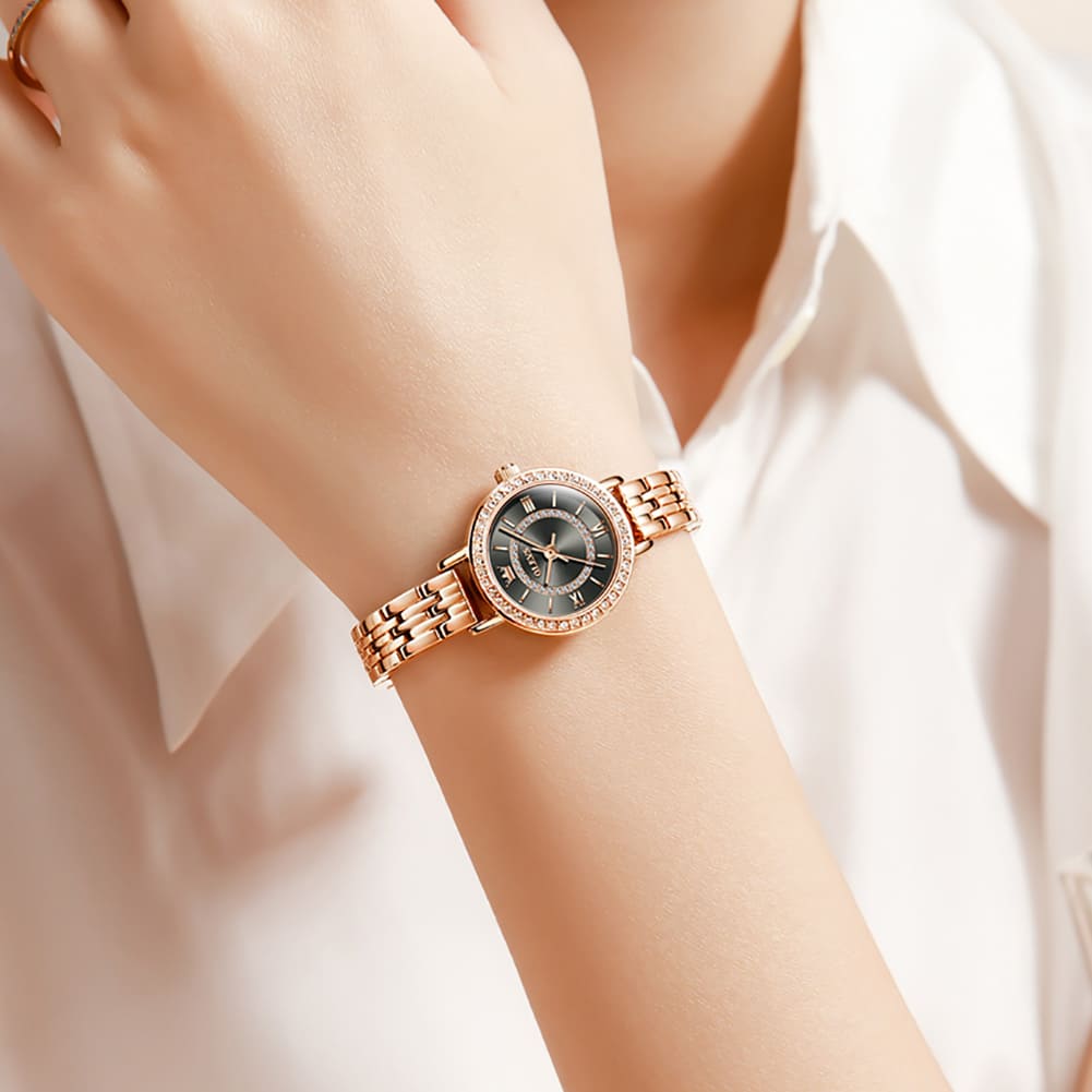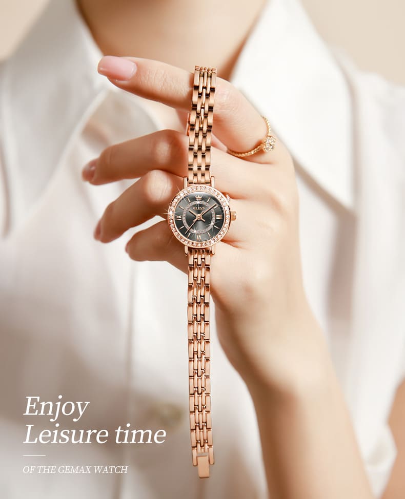 Small, sparkling, and sophisticated. The OLEVS 5508 is a jewelry-style timepiece designed for the delicate wrist. Featuring a petite 23mm case, it shines with a “Double Halo” of crystals—one ring on the bezel and another inside the dial. Finished in luxurious Rose Gold with a slim bracelet, it adds a touch of glamour to any outfit without feeling heavy.