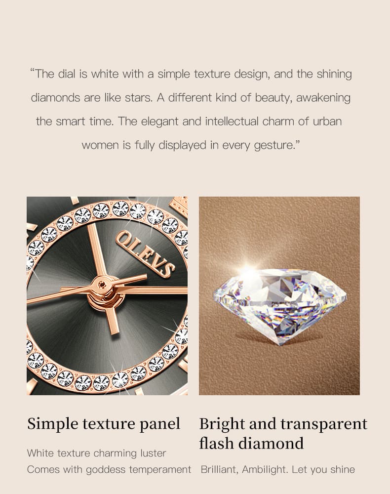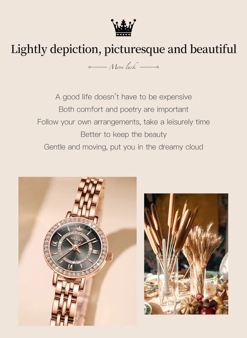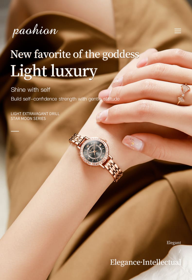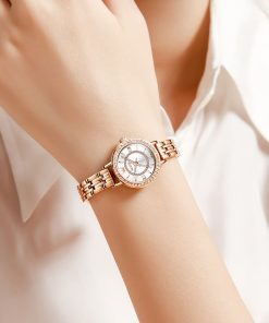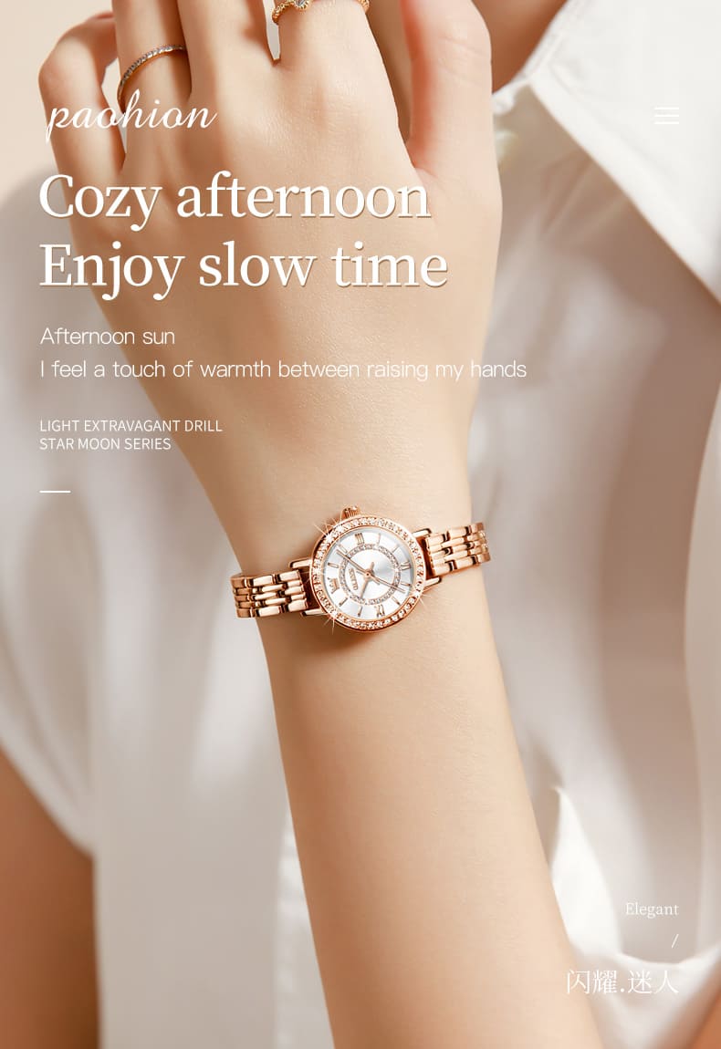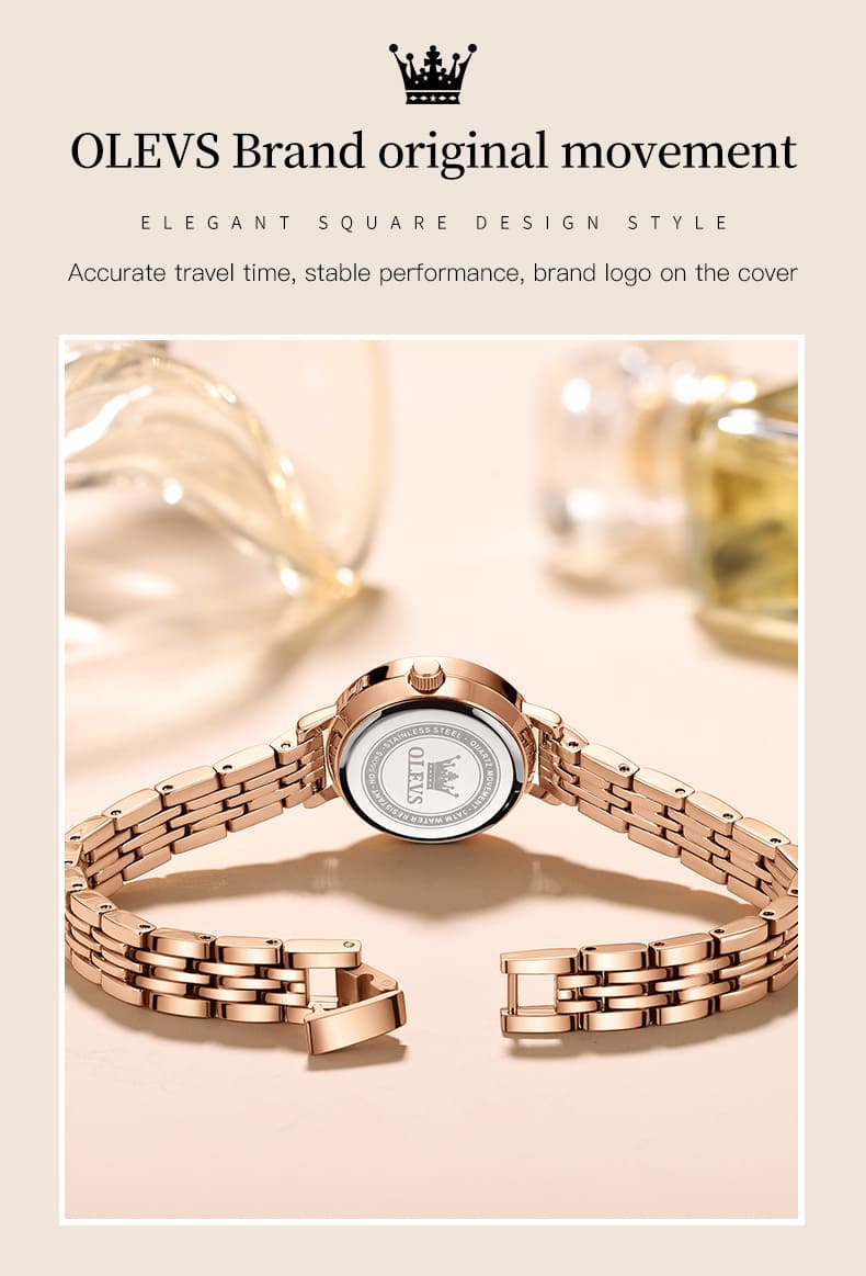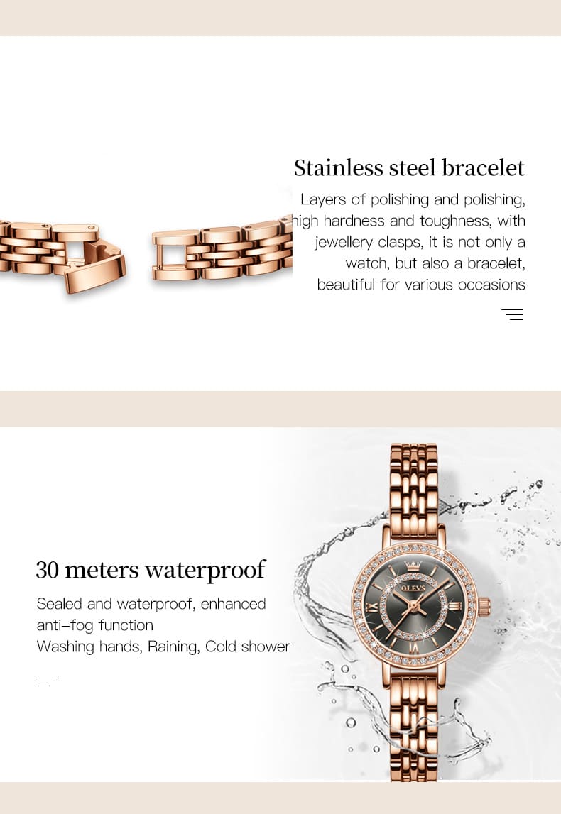 Small, sparkling, and sophisticated. The OLEVS 5508 is a jewelry-style timepiece designed for the delicate wrist. Featuring a petite 23mm case, it shines with a “Double Halo” of crystals—one ring on the bezel and another inside the dial. Finished in luxurious Rose Gold with a slim bracelet, it adds a touch of glamour to any outfit without feeling heavy.